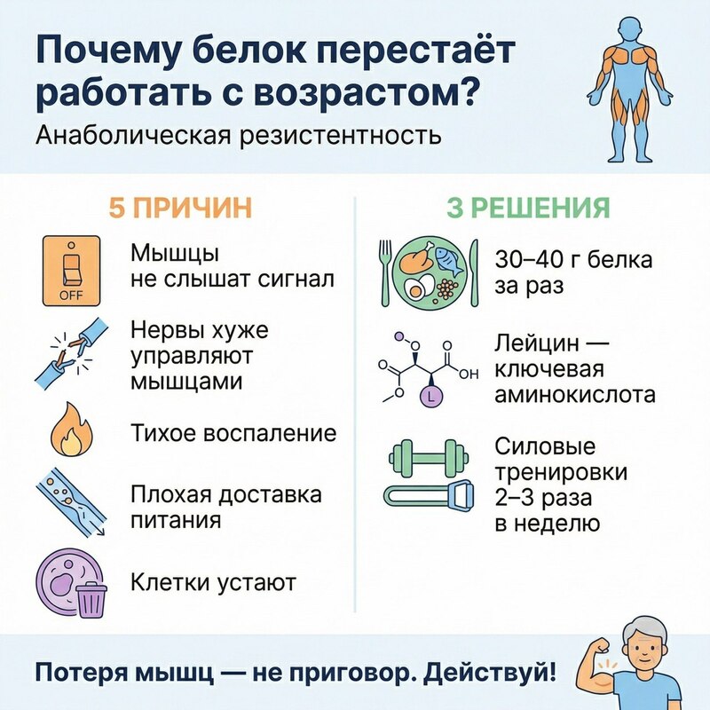 Но после 40–50 лет что-то меняется. Мышцы как будто становятся “глухими” к белку. Вы едите столько же, сколько раньше, а мышечная масса всё равно постепенно уходит. Это явление учёные называют анаболической резистентностью — то есть сопротивлением мышц к росту.